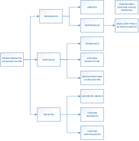 Los procedimientos de adjudicación de contratos que contempla la legislación española están en gran medida armonizados con la normativa europea. Existen tres grupos de procedimientos de licitación: ordinarios, especiales y masivos.