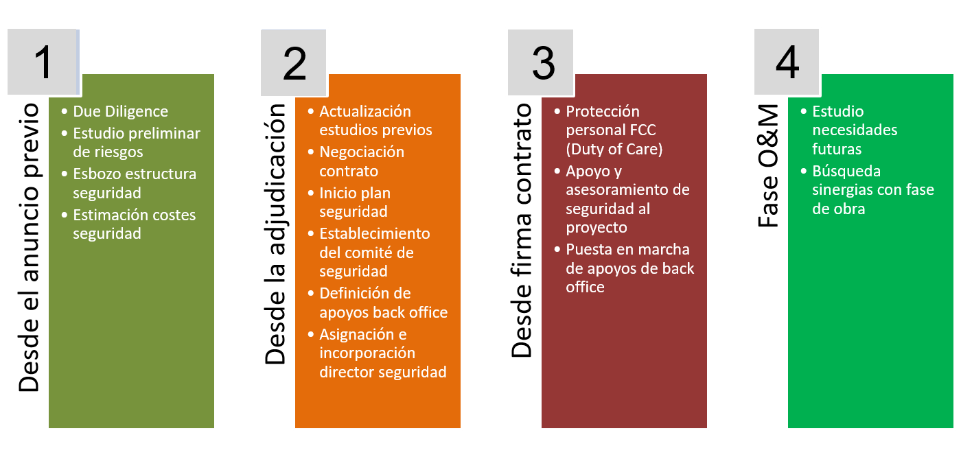 Los riesgos de seguridad no suelen estar incluidos en los mapas que manejan los gerentes de riesgos en los grandes proyectos o que valoran los responsables en los proyectos más pequeños. La Dirección de Seguridad de FCC es la instancia adecuada para asesorar a las áreas de negocio sobre los aspectos geopolíticos y de seguridad, así como las condiciones de seguridad y los riesgos en la zona concreta donde se ubique el proyecto.